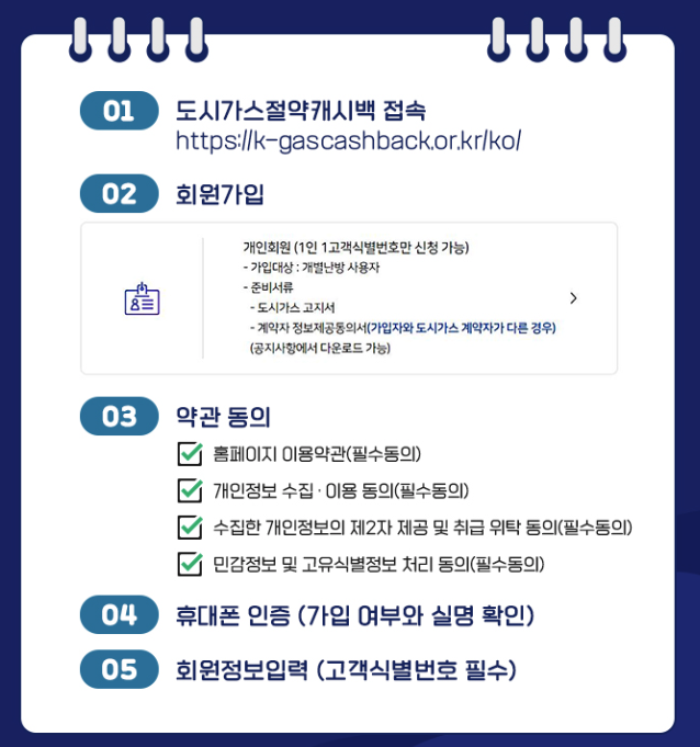 ๋„์‹œ๊ฐ€์Šค ์บ์‹œ๋ฐฑ ํ™ˆํŽ˜์ด์ง€์— ์ ‘์†ํ•ด ํšŒ์›๊ฐ€์ž…๋งŒ ํ•˜๋ฉด ๋ณ„๋„๋กœ ์‹ ์ฒญํ•˜๋Š” ๊ณผ์ • ์—†์ด ์ž๋™์œผ๋กœ ์‹ ์ฒญ์ด ๋ฉ๋‹ˆ๋‹ค.