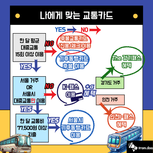 ๊ฐ์ž์˜ ์กฐ๊ฑด๋“ค์— ๋งž์ถฐ ๊ฐ€์žฅ ์ ํ•ฉํ•œ ๊ตํ†ต์นด๋“œ๋ฅผ ์„ ํƒํ•  ์ˆ˜ ์žˆ๋„๋ก ๋„์›€์ด ๋˜๋Š” ์ด๋ฏธ์ง€๋ฅผ ์ค€๋น„ํ–ˆ์Šต๋‹ˆ๋‹ค. ์ง€๊ธˆ ๋ฐ”๋กœ ํ™•์ธํ•˜๊ณ , ๋‚˜์—๊ฒŒ ๋”ฑ ๋งž๋Š” ์นด๋“œ๋กœ ๊ตํ†ต๋น„ ์ ˆ์•ฝ์„ ์‹œ์ž‘ํ•ด๋ณด์„ธ์š”!