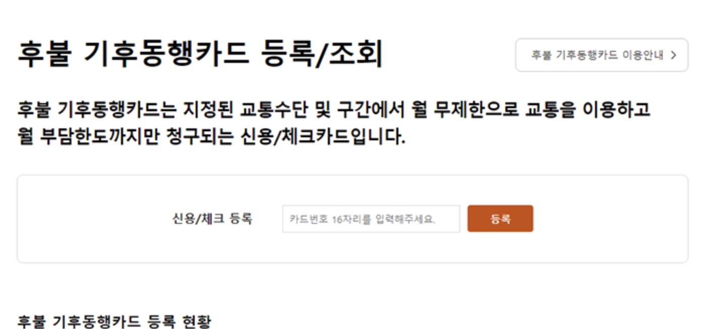 ๋ค๋ง, ๊ธฐ์กด์ ์ฌ์ฉํ๋ ์ ๋ถ๊ตํต์นด๋๋ก๋ ํ๋ถ ๊ธฐ๋ฅ์ ์ฌ์ฉํ ์ ์๊ธฐ์ ํ๋ถ๊ธฐ๋ฅ์ ์ฌ์ฉํ๋ ค๋ฉด ๋ณธ์ธ์ด ์ํ๋ ์นด๋์ฌ๋ฅผ ํตํด ๊ธฐํ๋ํ์นด๋๋ฅผ ๋ฐ๊ธ๋ฐ์์ผ ํ๋๋ฐ์.