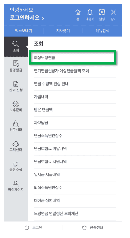 : ๋ชจ๋ฐ์ผ ์ฑ์์๋ ํ๋ฉด์์ ‘๋ด ๊ณ์ ๊ตญ๋ฏผ์ฐ๊ธ’ → ์ ์ฒด ๋ฉ๋ด → ์์๋ ธ๋ น์ฐ๊ธ ์์ฐจ์ ์ผ๋ก ์ ํํ์๋ฉด ์ ์์ด ๊ฐ๋ฅํฉ๋๋ค.