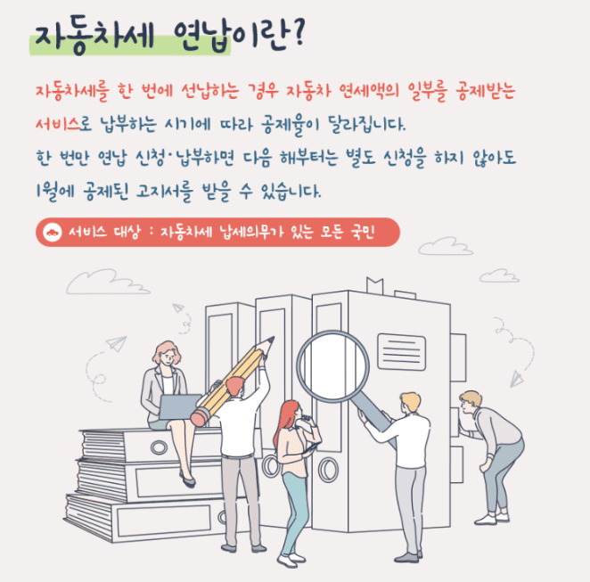 ์ž๋™์ฐจ์„ธ๋Š” ์–ด์ฐจํ”ผ ๋‚ด์•ผํ•˜๋Š” ์„ธ๊ธˆ์ด๊ธฐ ๋•Œ๋ฌธ์—, ์ด์™• ๋‚ด๋Š” ๊ฒƒ ์—ฐ๋‚ฉ ์‹ ์ฒญ์œผ๋กœ ํ• ์ธ ํ˜œํƒ์„ ๋ฐ›๋Š” ๊ฒƒ์„ ๊ถŒ์žฅํ•ฉ๋‹ˆ๋‹ค.