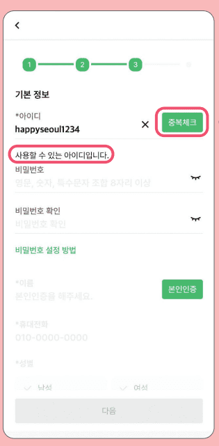 2-2. ์ด์ ๋ถํฐ๋ ํ์์ ๋ณด๋ฅผ ์์ฐจ์ ์ผ๋ก ์ ๋ ฅํด ์ฃผ์๋ฉด ๋ฉ๋๋ค. (์์ด๋ โถ ๋น๋ฐ๋ฒํธ โถ ํด๋ํฐ ๋ณธ์ธ์ธ์ฆ โถ ํค, ์ฒด์ค, ๊ฑฐ์ฃผ์ง)