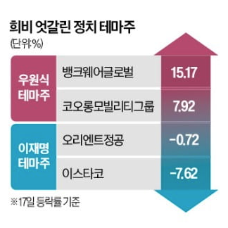 ์ ์น ํ ๋ง์ฃผ๋ ์ ์น์ ์ธ๋ฌผ, ์ ๊ฑฐ, ์ ์ฑ ๋ฑ๊ณผ ๊ด๋ จ๋ ์ฃผ์ ์ข ๋ชฉ์ ์๋ฏธํ๋๋ฐ์. ํน์ ์ ์น์ธ์ด ๋์ , ์ด์ ๋ฑ์์ ์ ๋ ฅ ํ๋ณด๋ก ๋ ์ค๋ฅด๋ฉด, ๊ทธ์ ์ฐ๊ด๋ ๊ธฐ์ ์ด๋ ์ฌ์ ์ด ์ฃผ๋ชฉ๋ฐ์ ์ฃผ๊ฐ๊ฐ ๊ธ๋ฑํ๋ ๊ฒฝ์ฐ๊ฐ ๋ง์ต๋๋ค.