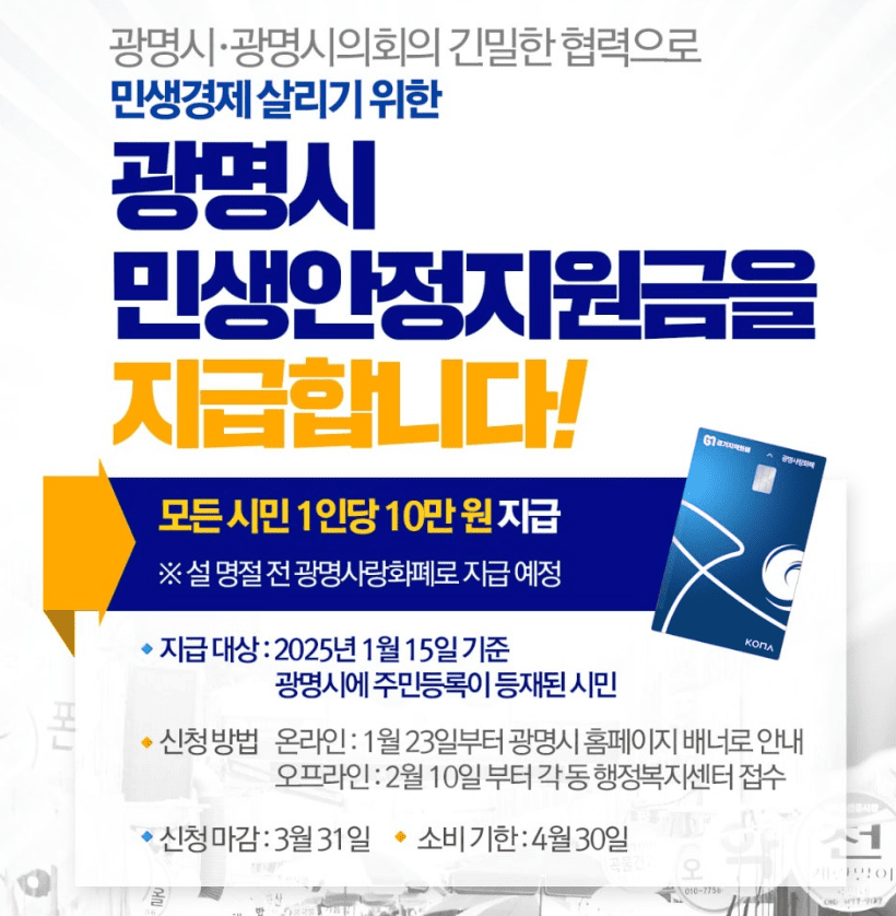๊ด๋ช ์๊ฐ ์ง์ญ ๊ฒฝ์ ๋ฅผ ์ด๋ฆฌ๊ธฐ ์ํด ๋ชจ๋ ์๋ฏผ์๊ฒ ์ง๊ธํ๋ 10๋ง ์์ ์ง์๊ธ์ ๋๋ค. 2025๋ 1์ 15์ผ ๊ธฐ์ค์ผ๋ก ๊ด๋ช ์์ ์ฃผ๋ฏผ๋ฑ๋ก์ด ๋์ด ์๋ค๋ฉด, ๋์ด·์๋·์ง์ ์์ด ๋๊ตฌ๋ ๋ฐ์ ์ ์์ต๋๋ค.