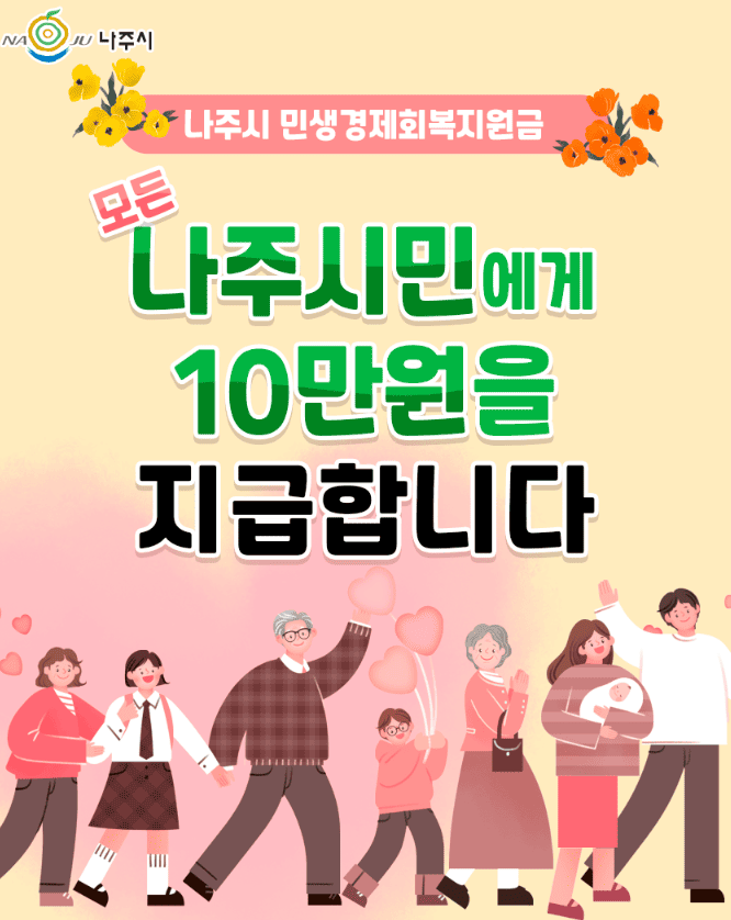 ๋‚˜์ฃผ์‹œ๊ฐ€ ์ง€์—ญ ๊ฒฝ์ œ๋ฅผ ์‚ด๋ฆฌ๊ธฐ ์œ„ํ•ด ๋ชจ๋“  ์‹œ๋ฏผ์—๊ฒŒ ์ง€๊ธ‰ํ•˜๋Š” 10๋งŒ ์›์˜ ์ง€์›๊ธˆ์ž…๋‹ˆ๋‹ค.