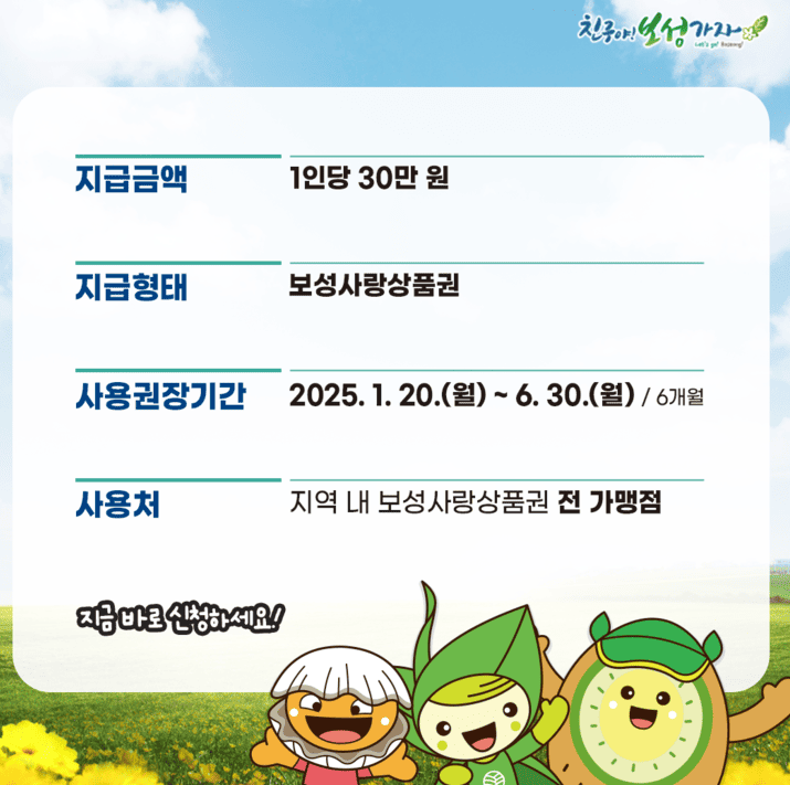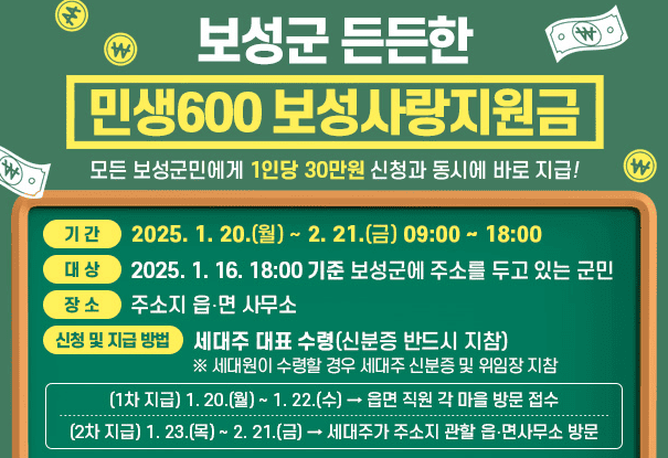 ๋ณด์„ฑ๊ตฐ์ด ์ง€์—ญ ๊ฒฝ์ œ๋ฅผ ์‚ด๋ฆฌ๊ธฐ ์œ„ํ•ด ๋ชจ๋“  ๊ตฐ๋ฏผ์—๊ฒŒ ์ง€๊ธ‰ํ•˜๋Š” 30๋งŒ์›์˜ ์ง€์›๊ธˆ์ž…๋‹ˆ๋‹ค.
