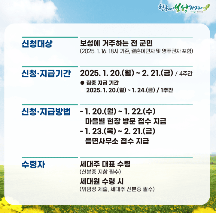 2025๋ 1์ 16์ผ 18:00๊ธฐ์ค ๋ณด์ฑ๊ตฐ์ ์ฃผ๋ฏผ๋ฑ๋ก์ด ๋์ด์๋ค๋ฉด, ๋์ด·์๋·์ง์ ์์ด ๋๊ตฌ๋ ๋ฐ์ ์ ์์ต๋๋ค.