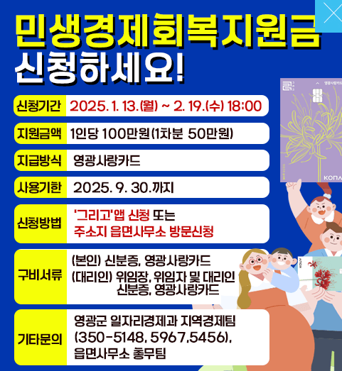 ํ์ง๋ง ์ด๋ฒ ๋ฌ, ์๊ด๊ตฐ์์ ๋ชจ๋ ์๋ฏผ์๊ฒ 1์ธ๋น 50๋ง์์ ์ผ์ํ๋ณต์ง์๊ธ์ ์ง๊ธํ๋ค๋ ์์์ ๋ฃ๊ณ ๋์ด ๋ฐ์ง์์ต๋๋ค. ์ด๋ฒ ๊ธ์์ ์ ์ฒญ๋ฐฉ๋ฒ๋ถํฐ ์ฌ์ฉ์ฒ๊น์ง ๋ชจ๋ ์ ๋ณด๋ฅผ ์ป์ด๊ฐ์ธ์!